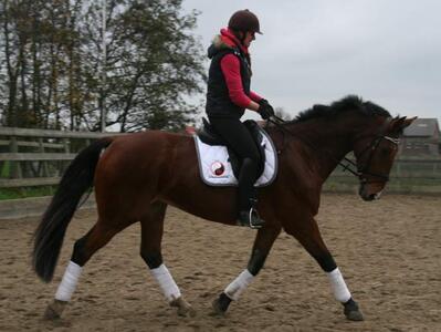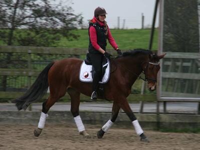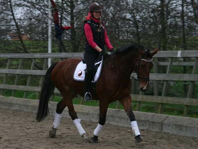 Met rijden is hij erg braaf, hij bokt en steigert niet, is lekker voorwaarts en reageert goed op je hulpen. Hij heeft vroeger voor de wagen gelopen dus is goed verkeersmak.