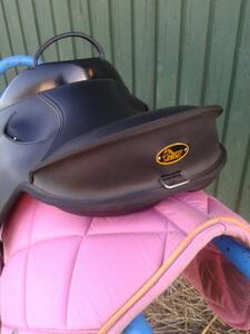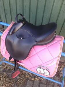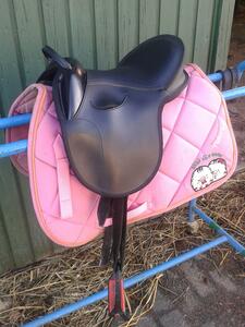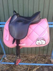 Mooi lichtgewicht ponyzadel van Harry's Horse (13 inch) met handgreep aan de voorkant en een stevige diepe zit. Een heel fijn zadel voor shetlandpony's dat veel beter op de rug ligt dan zo'n goedkoop pinokkio zadeltje. Er zit ook een bevestiging voor een staartriem aan het zadel maar bij onze pony ligt hij prima zonder staartriem dus die hebben wij nooit gebruikt. Het blijft goed liggen en schuift niet naar voren. Het zadel is gemaakt van sterk kunststof leather-look materiaal waardoor het zeer onderhoudsvriendelijk is. Te koop inclusief singel, beugelriemen (dit zijn vrij lange zwarte nylon beugelriemen, die heb ik erbij gekocht omdat mijn dochter vrij lange benen heeft) en stijgbeugels. Deze beugels zijn ook van Harry's Horse met een roze inleg. De prijs voor het zadel compleet met singel, beugelriemen en stijgbeugels is 100 euro, dit is een vaste prijs. Nieuwprijs was 170 euro (compleet) en het is pas 9 maanden oud. Niet intensief mee gereden en ziet er dus nog heel mooi uit. Het mooie Tekna roze zadeldekje kan er voor 12,50 euro bijgekocht worden (nieuwprijs 24,95). Voor verkoop zal ik dit natuurlijk nog even wassen, zodat het er weer als nieuw uitziet. Dekje is ook los te koop.