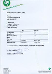 Ze heeft geen stalgebreken en is sociaal tegenover mens en dier. Ook trailerladen is geen probleem, door 1 persoon te laden. Op 12-02-2014 is Verona röntgenologisch goedgekeurd. Het dierenartsrapport is in te zien bij de foto's.