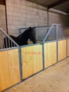 Van gegalvaniseerd 5x5 cm kokerprofielen zwaar metaal, nieuw, met vurenhout 3,8 cm dik (speciaal soort grenen zeer sterk en onbehandeld) dus kan in elk gewenst kleur geschilderd c.q. gelakt worden. Onze binnenstallen hebben standaardhoogte van 2 meter. De zijwanden / tussenwanden worden door middel van 50x50 cm stalen spanten verbonden voor een veilige / solide constructie. Alle bevestingsmaterialen zijn inbegrepen (inclusief schuifsloten).