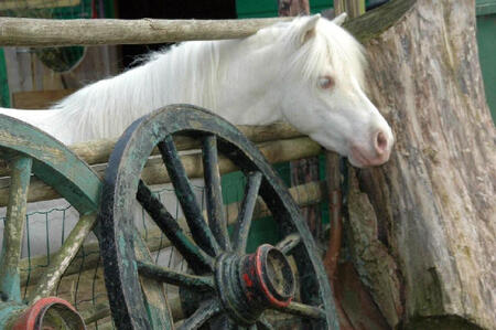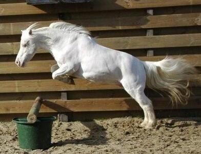 De meeste nakomelingen van hem zijn bont en sommige hebben ook blauwe ogen.