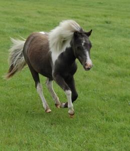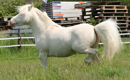 Doordat hij Cremello is geeft hij aparte kleuren door. Tot nu toe heeft hij te kleuren :