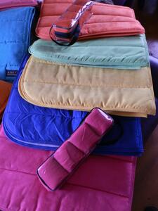 De PK dressuur dekjes zijn fluoriserend fel qua kleur, de foto doet ze echt geen recht. Per pad 25 euro, een pad met bandages 35 euro. Alle 5 pads voor 100 euro. Alle pads + de bandages voor 110 euro. Ze zijn allemaal nieuw of zo goed als nieuw. De blauwe pas is inmiddels verkocht