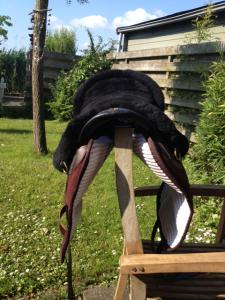Gloednieuw! Slechts 3,5 kg. Maat 16 inch L, wat gelijk staat aan de 'normale' 17,5/18 inch. Qua boommaat past hij goed op een grote arabier (1,57). Inclusief bontje en zadeltas.