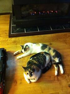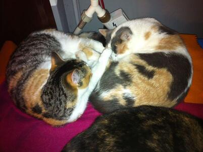 Beide poezen zijn lief, maar hier geen echte schootpoezen. Ze houden zeker wel van een aai en een knuffeltje op z'n tijd. 's morgens zitten ze daar al voor klaar. Wij pakken de poezen zelf ook nooit op, dus mogelijk zitten er wel heel veel knuffelcapaciteiten in. ;-)