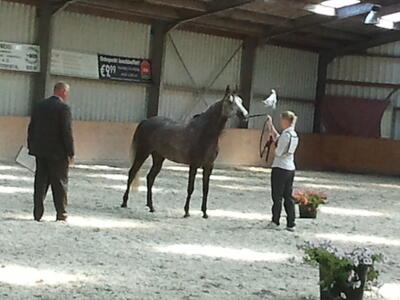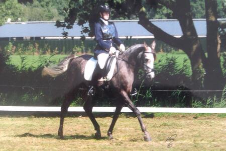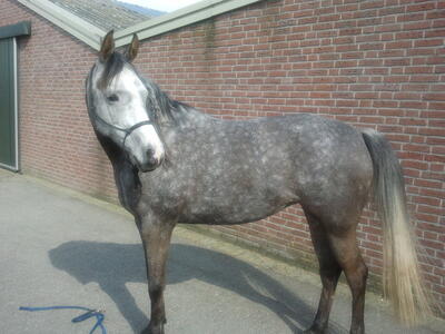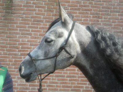 Wegens overgang naar paard, tkab. eigen gefokte 6 jarige schimmel merrie. L1 dressuur, B springen en cross. Super braaf, fijn en aanhankelijk in omgang. Geen stalgebreken, verkeers- en trailermak. Ideale pony voor kinderen. Is bomproof!