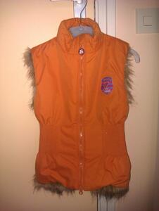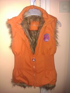 Leuke oranje bodywarmer met (nep)bont voering, fijn voor straks in de winter