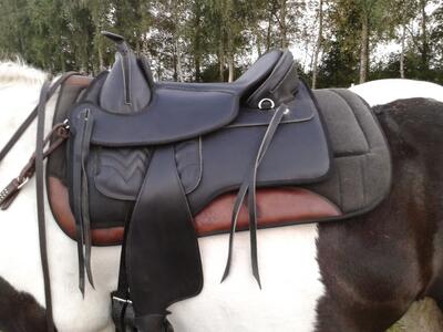Boomloos zadel westen zadel, merk onbekend, maar ik, als kieskeurige die nooit iets anders wilde dan de echte barefoot, vind dit zadel wbt kwaliteit en uiterlijk ten minste gelijkwaardig, al dan niet beter. Het ligt net zo goed, maar zit zachter, er zitten zelfs gelpads in de beugels! De kleur is zwart. Inclusief fenders en beugels, en inclusief HAF pad die de druk onder het zadel tot in de puntjes verdeeld en daarnaast met de anti-slip onderkant ervoor zorgt dat het zadel perfect op zijn plaatst blijft. Het zadel heeft engelse singelstoten en je krijgt er een singel naar keuze bij (Rossner comfort, Holu met zwart bont of klassieke leder).