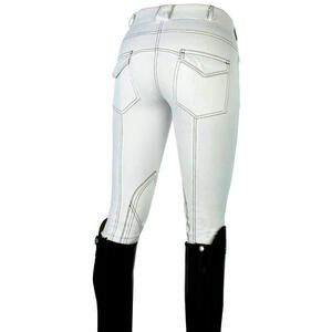 Denim Full-Seat rijbroek voor dames met contrasterende stiksels en decoratieve riem op de achterkant van taille.