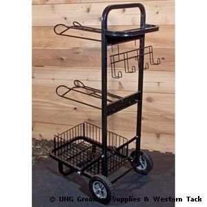 Multifunctionele zadelcaddy met twee afneembare zadelhouders en een verwijderbare tackrack met 5 haken en mand. Kan ook gebruik worden als steekwagen voor bv. balen stro, hooi of zakken graan of bix.