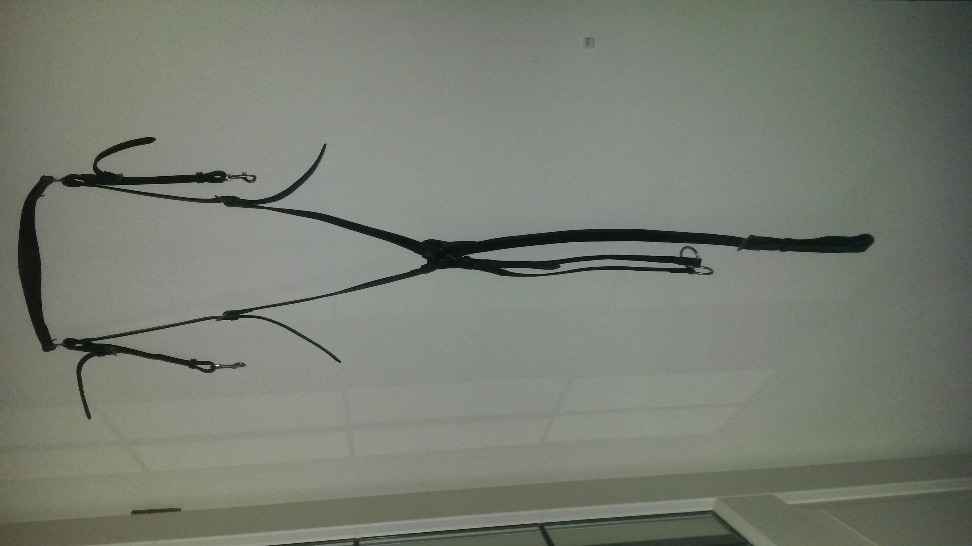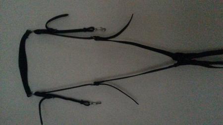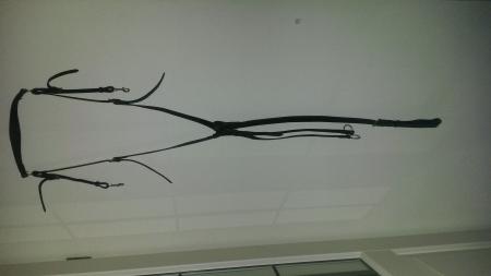 Verstelbaar om de nek, vast te klikken aan de ringetjes van het zadel. Martingaal deel evt. ook los te maken en verstelbaar.