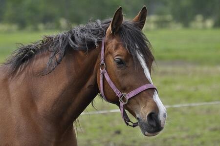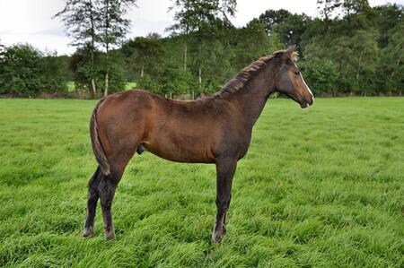 Een bruine hengst met bles. Geen andere aftekeningen.