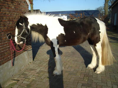 te koop: 4 jarige tinker Liberty. Kent beginselen van longeren, braaf aan de hand en bij de hoefsmid en trailer. Elke keer ontwormd,geent en afgelopen december behandeld door de tandarts. Schofthoogte ong. 1.45m maar zal nog wat groeien. Als veulen opgenomen in het nsvt, vader Gulliver o'Britain. Had als veulen een 1ste premie en reserve dagkampioen.Later niet meer naar keuringen geweest.