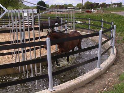Standaard bouwpakket voor het maken van een longeercirkel met het degelijke Beo-band, kunststof palen en een stalen hek.
