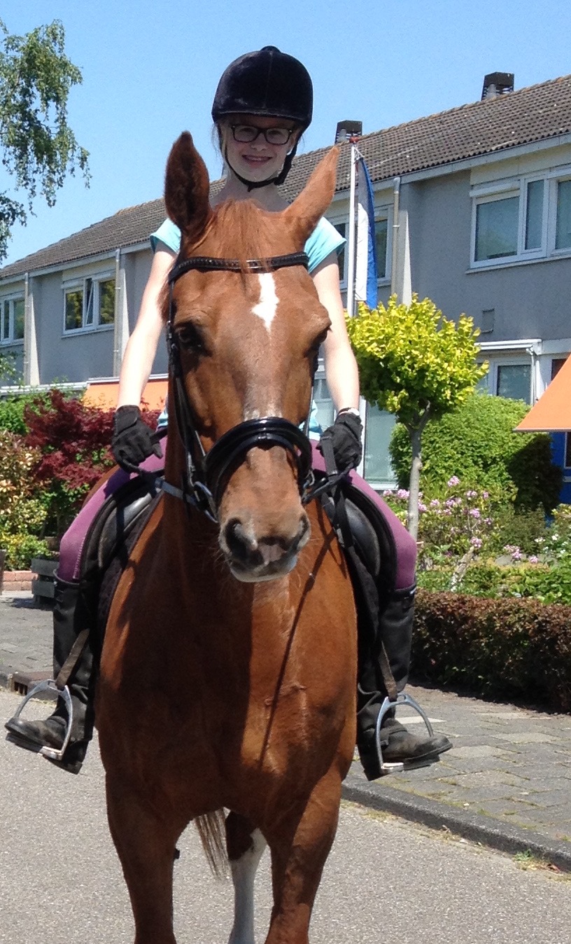 Dat we Jolly te koop aan bieden is voor ons ook niet gemakkelijk, maar het is beter, ook voor haar. Zij vindt naar buiten gaan ook geweldig, maar ze is kan hier niet aan de omgeving wennen doordat er geen andere paarden zijn die mee de straat op kunnen. Daardoor is zij onzeker als ze alleen de straat op moet, en dat wil ze ook nog niet. Ik ben ervan overtuigd, dat als ze een aantal keer de straat op is geweest met een ander paard, dat ze zonder problemen de straat op gaat. Haar vorige eigenaresse reed namelijk ook gewoon alleen met haar op straat. Aan de hand gaat het overigens heel goed. Ze zal niet terug rennen naar de stal, maar ze wil niet meer verder lopen en blijft dus stilstaan. Ik ben 2x met haar de straat op geweest met andere paarden erbij, en dat ging echt super. Helaas heb ik hier niet de kans het verder met haar te oefenen. Ze is niet bang voor groot verkeer. Met andere paarden is ze zo goed als bomproef, ze loopt ook graag voorop.