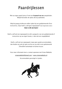 Heeft u zelf wel een eigenpaard en wilt u graag les van een gediplomeerde Z instructrice op uw eigen locatie, is dat ook een van de opties.