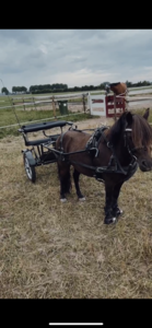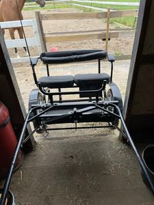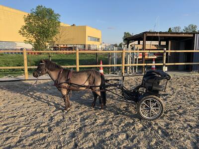 Mooie cavalettie sport editie. Ongeveer 2 jaar geleden heb ik deze gekocht voor mijn shetlander. Het is een super fijne sulky, er zit een rem op wat ik zelf altijd een fijne extra veiligheid vond en verder ziet hij er chique uit. Er zitten wel wat kleine roestplekjes op en wat slijtage plekjes bij de bekleding van de armleuningen, verder verkeert hij in super goede staat. Je kunt zelfs met z'n 2en op het bankje zitten. En ik heb er ook het bijbehorende bok kussen bij. Ook zit er nog een zelfgemaakte extra kussen voor de rugleuning bij, die zit met klitteband bevestigd. zorgt ervoor dat je net wat comfortabeler zit!