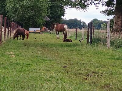 De ponys krijg in de winter ruwvoer, zomers gras. De plek is niet geschikt voor hoefbevangen ponys ivm met ook gras op de track.