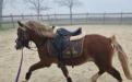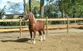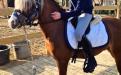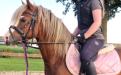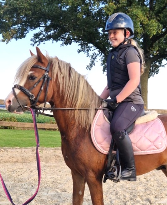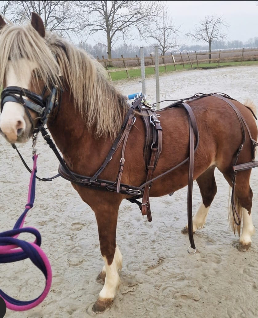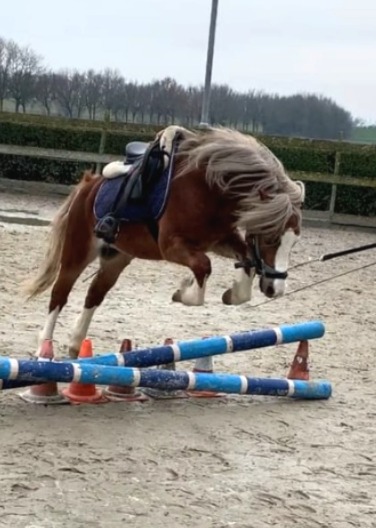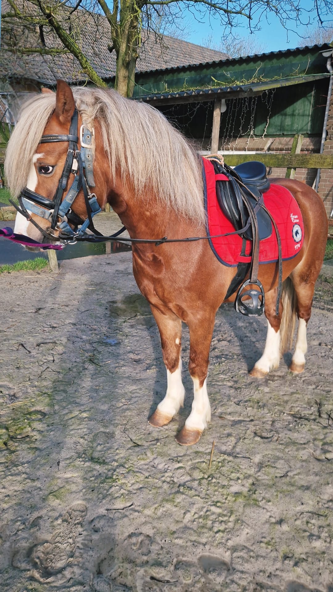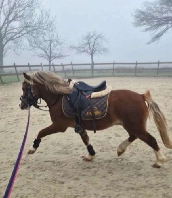 We hebben hem tot nu toe +/- 5-6 keer onder het zadel gehad. Hij pakt dit super fijn op. We hebben stap, draf en galop aan de longeerlijn gedaan. Hij heeft een voorwaartse instelling en loopt makkelijk door.