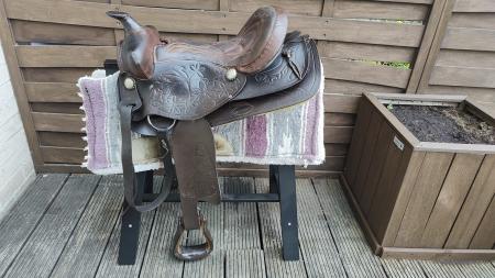 Incl. singel en pad (scheur in het stukje leer waar de singel overheen gaat)