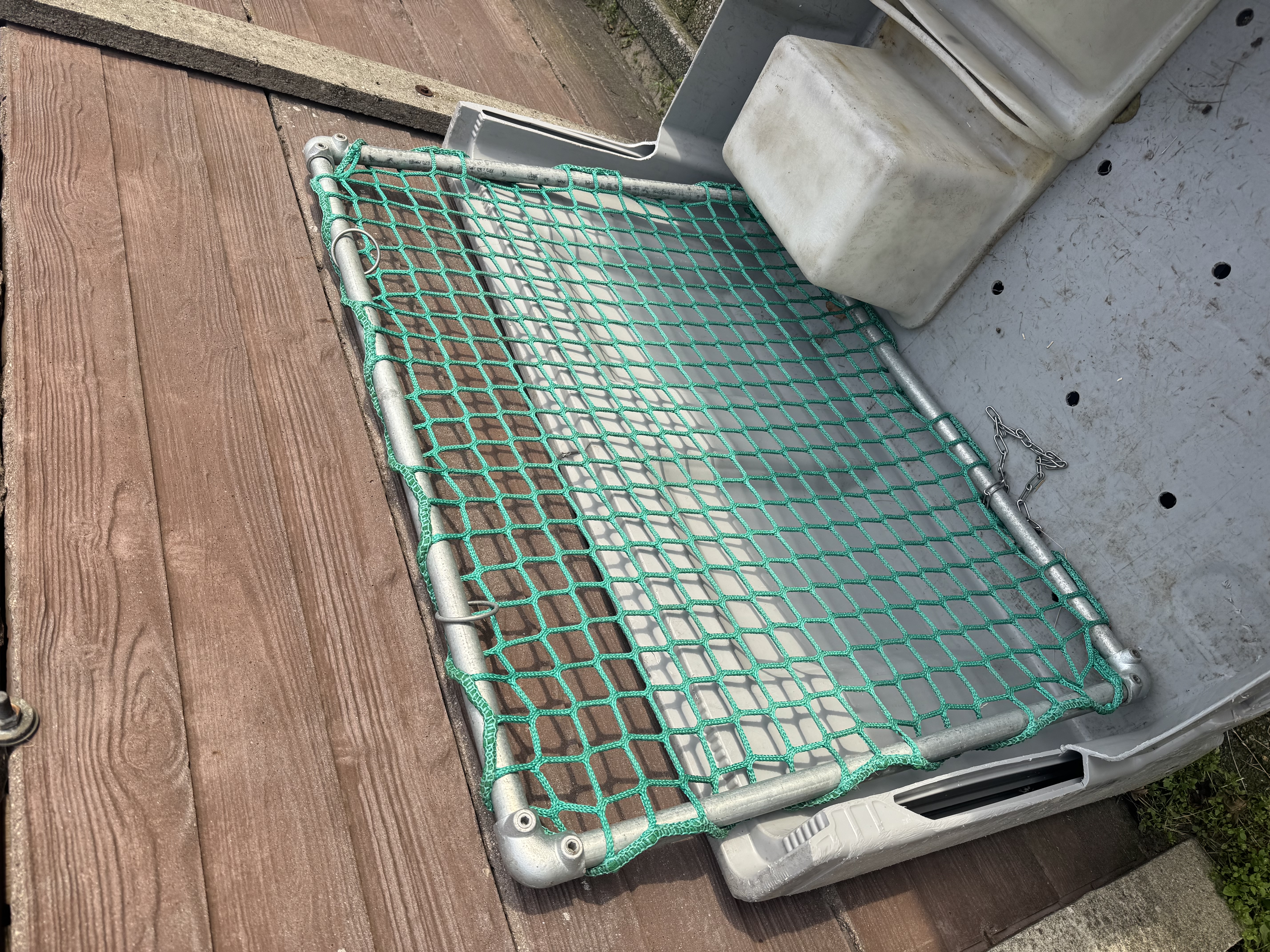 Zgan Slowfeedernetten + frames 40 mm mazen met bevestigingsmateriaal, voor in een kuubkist of ander soort kist, 3 stuks. Het frame met net met bevestigingsmateriaal had nieuwprijs van 119,95, vraagprijs is 80 euro per stuk. De frames zijn niet heel lang gebruikt en ook nog niet oud.