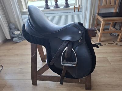 Wegens overcompleet en niet gebruiken te koop: Euroriding Jade Veelzijdigheidszadel, 18 inch, medium. In goede staat, slechts wat lichte gebruikssporen. Inclusief beugels en beugelriemen.