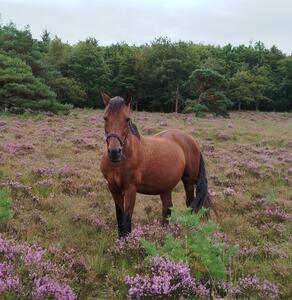 De paarden staan 24/7 buiten. Een deel van het jaar bij de verhuurder achter het huis (ongeveer 2ha), een deel van het jaar op land van Staatsbosbeheer. Het is direct aan het Dwingelderveld gelegen.