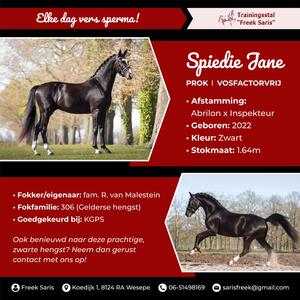 Met trots kondigen wij aan: Spiedie Jane is nu beschikbaar voor de dekdienst bij Freek Saris! Spiedie Jane, combineert kracht, uitstraling en een indrukwekkend karakter. Met zijn zwarte kleur, bewezen afstamming en sportieve prestaties is hij de perfecte match voor de fokkerij. Deze kans om Spiedie Jane in te zetten voor uw fokprogramma mag niet gemist worden!Voor dekaanvragen of meer informatie kunt u altijd contact met ons opnemen.Maak gebruik van deze unieke kans en zet in op een toekomst vol succes!