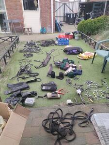 Borstels, sporen, teugels, borstuig, neusriemen, bandages, doos vol been bescherming, reisbesterming etc