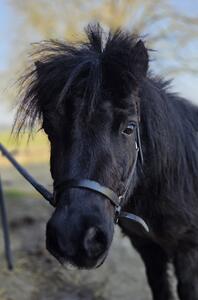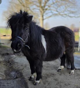 Moos is 6 jaar en 90 cm hoog. Hij is sociaal met grote en kleine paarden. Hij is lief, soms ondeugend, blijft netjes achter de draden (zonder stroom) en komt als je hem roept. Helaas kan hij niet de hele dag op gras, hij krijgt daar jeuk van en een enorme opgeblazen buik. 2 a 3 uurtjes met graasmasker op de wei gaat goed.