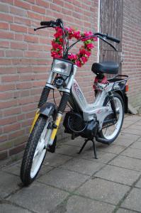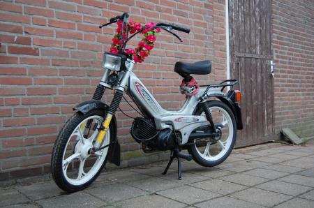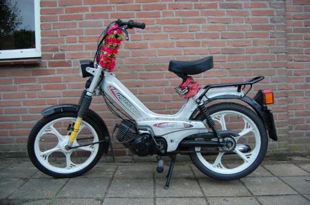 Tevens bevind zich op de brommer ook een kilometer teller, een goed kettingslot en er zit een kickstartrubber op.