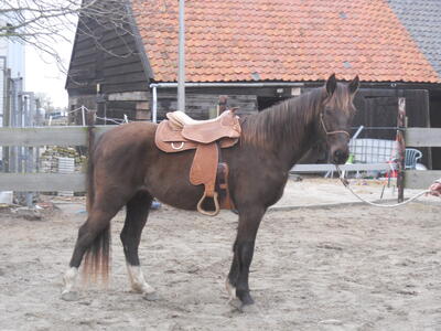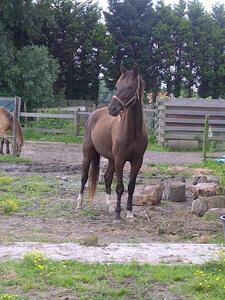 Apollo zijn halfbroertje Duncan, Duncan is een kruising ijslander x kentucky mountain horse, met toltaanleg. Hij is 2 jaar en nu ong. 1.35m, ik verwacht dat ie iets van 1.45m gaat worden. Hij is valkkleurig.