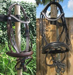 Profi-Rider hoofdstel zeer zacht anatomisch gevormd kopstuk, zeer zachte bonfire/aansnoerneusriem 4cm breed, swarosvki wave frontriem, zacht soepel leer, zeer goede kwaliteit mooi afgewerkt incl. ant-slipteugels, (Zwart Pony, Cob, Full) (Bruin met goudkleurige gespen Cob, Full) Normaal €129,95 nu €49,95