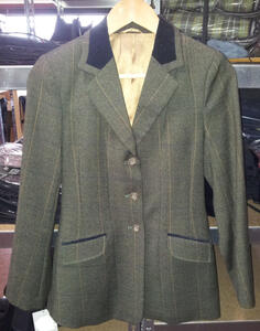 Dubbelle rijsplit achterkant, en voorzien van fluwelen kraag en fluwelen bies langs zakjes.