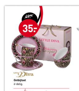 Ontbijtset van Little Diva. Set zoals op de foto en bestaat uit: 2x bord, 2x mok en 2x kom