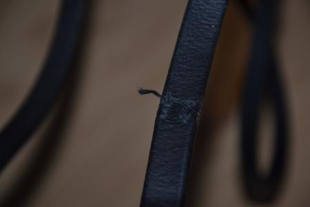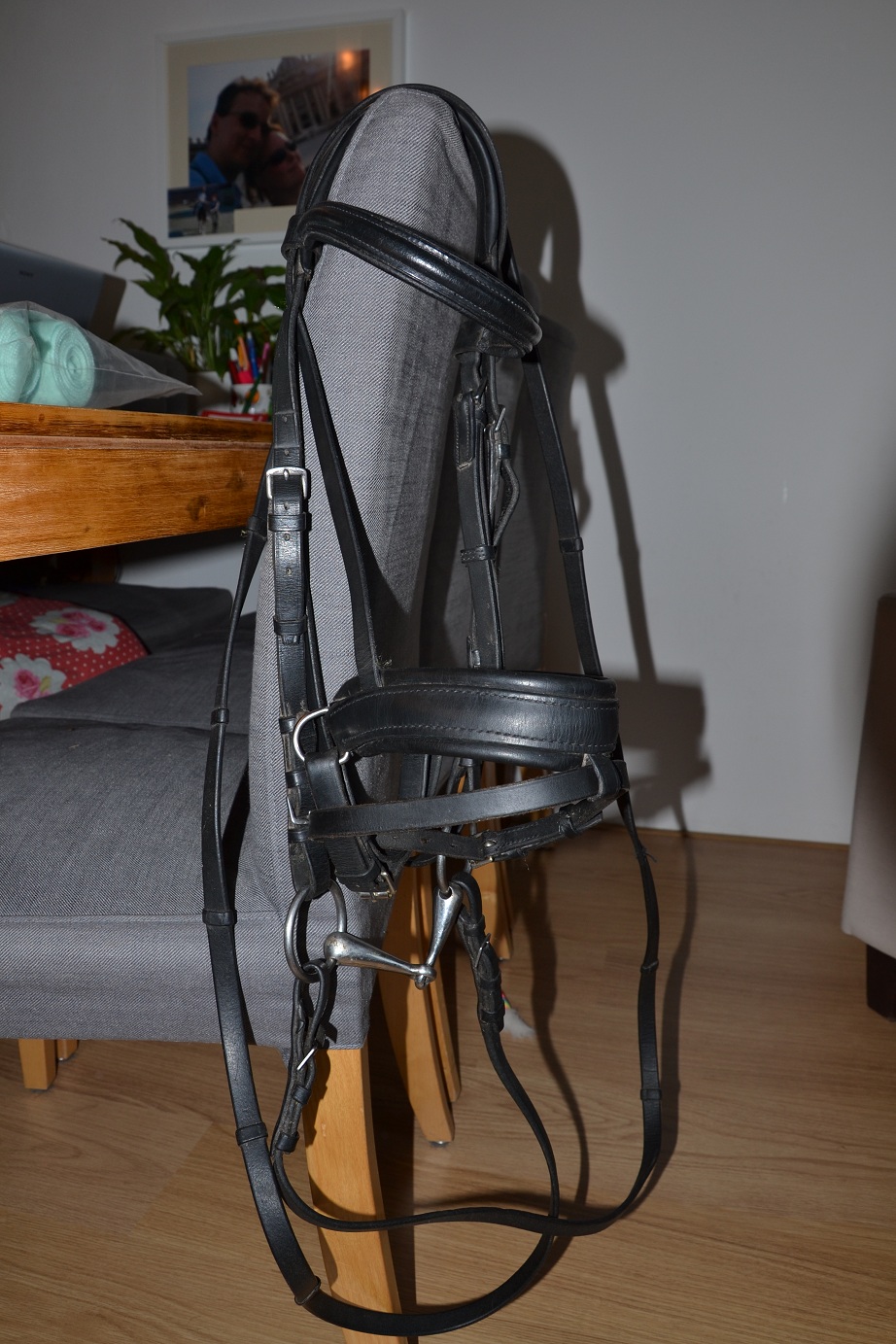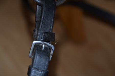 Helaas zitten de oorspronkelijke teugels er niet bij, heb er lederen teugels bij gedaan, alleen die zij niet meer in geheel goede staat (zie foto's: mist een leertje en een passantje).